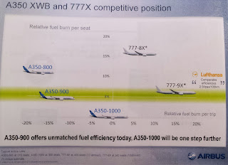 Airbus notes its A350-1000 customers believe that this aircraft can replace the 777-300ER while being 40 tonnes lighter (savings of 20t in fuel and 20t in structure) on a 6,500 mile mission with 350 passengers. But Airbus then went to explain the nuance of seat count differences even though the A350-1000 and 777-300ER are the same size. The 777-300ER has five doors to the four on the A350-1000. At a standard nine-abreast seating the A350-1000 can fit a few more seats.